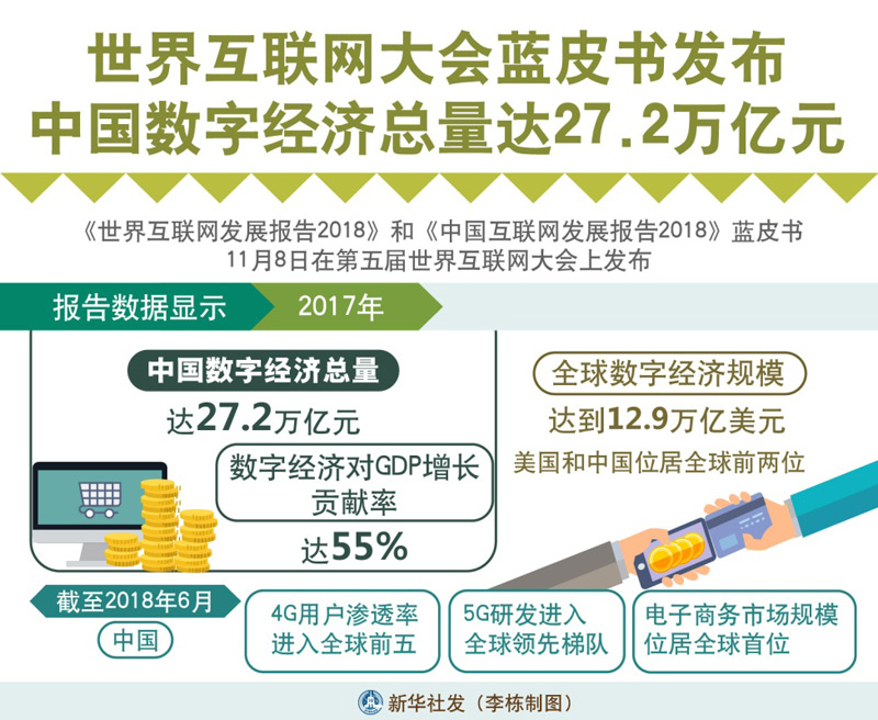 【合肥網(wǎng)站建設(shè)訊】第五屆世界互聯(lián)網(wǎng)大會于11月7日至9日在烏鎮(zhèn)舉辦。《世界互聯(lián)網(wǎng)發(fā)展報告2018》和《中國互聯(lián)網(wǎng)發(fā)展報告2018》藍皮書8日在第五屆世界互聯(lián)網(wǎng)大會上發(fā)布。報告顯示,2017年,中國數(shù)字經(jīng)濟總量達27.2萬億元,數(shù)字經(jīng)濟對GDP增長貢獻率達55%。截至2018年6月,中國4G用戶滲透率進入全球前五,5G研發(fā)進入全球領(lǐng)先梯隊,電子商務(wù)市場規(guī)模位居全球首位。